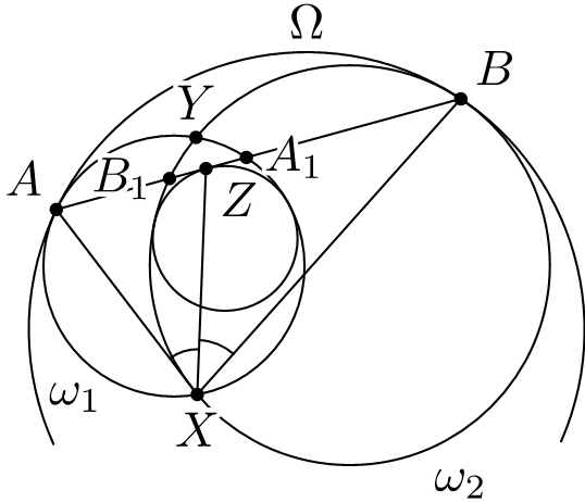 Задача №1. Две пересекающиеся в точках $X$ и $Y$ окружности $\omega_1$ и $\omega_2$ находятся внутри окружности $\Omega$ и касаются ее в точках $A$ и $B$. Прямая $AB$ повторно пересекает окружности $\omega_1$ и $\omega_2$ в точках $A_1$ и $B_1$, соответственно. Вписанная в криволинейный треугольник $A_1B_1X$ окружность касается стороны $A_1B_1$ в точке $Z$. Докажите, что $\angle AXZ=\angle BXZ$.