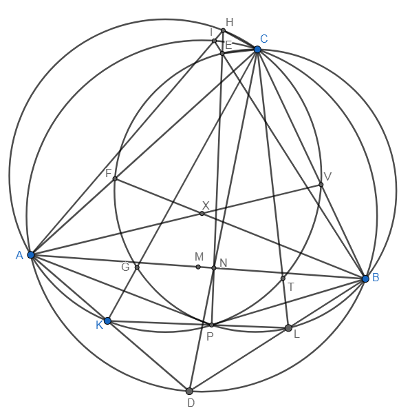 1)Покажем что точка $P$ лежит на отрезке $KL$ , положим что это так $P \in KL$ получим $ \angle LPC=180^{\circ} - \angle DBC$ и $ \angle KPC=180^{\circ}-\angle DAC$ из того что четырехугольники $PLBC$ и $AKPC$ вписанные, суммируя получим $360^{\circ} - (\angle DBC + \angle DAC) = 360^{\circ}-180^{\circ}=180^{\circ}$ учитывая то что $ABCD$ вписанный, чтд. По условию $\angle KCA = \angle LCB$ тогда $AKTV, GFBL$ равнобедренные трапеции, пусть $ X \in AV \cap BF$ тогда $ABX$ равнобедренный, так как $\angle GLB = \angle AKT$.