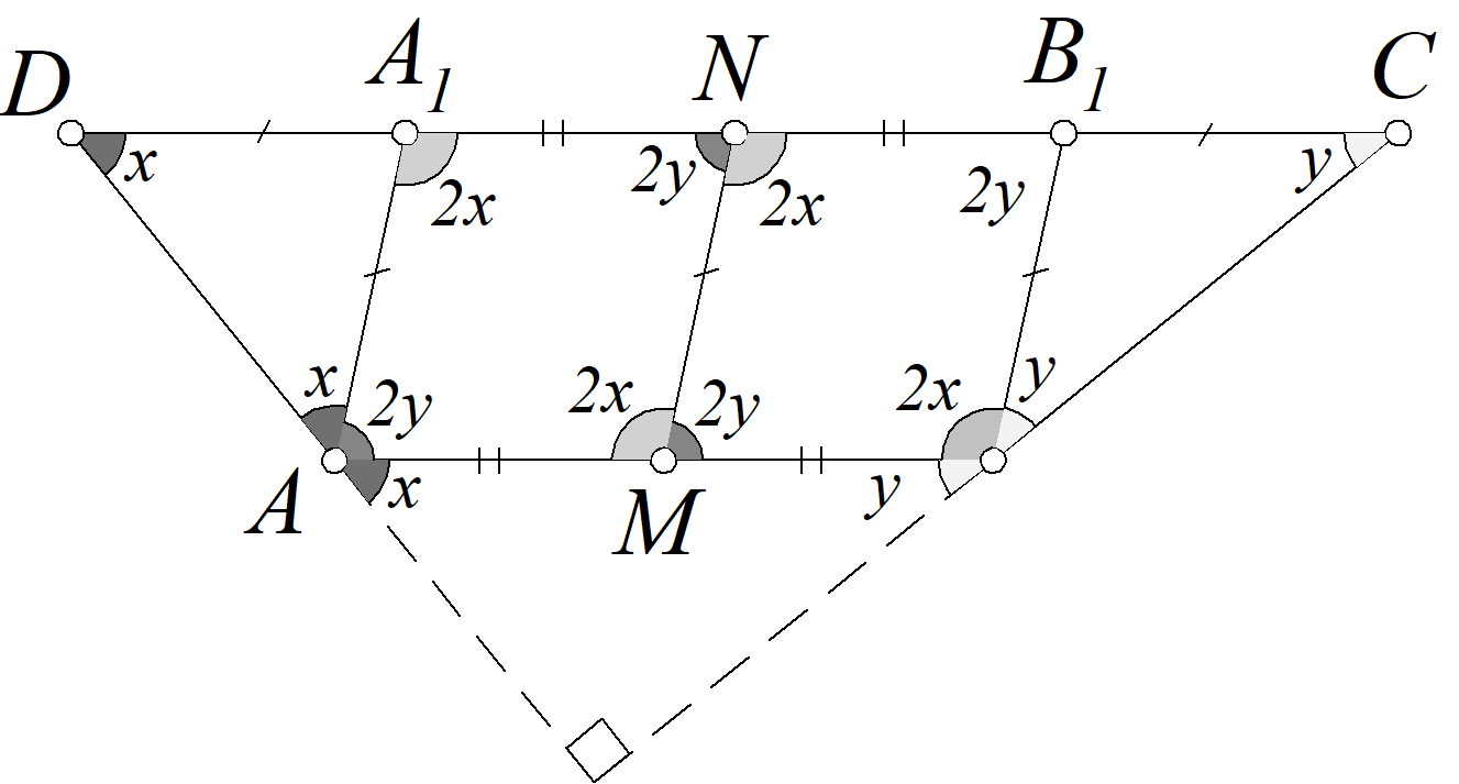 10)Счет углов: $$\angle A + \angle D = \angle A_1DA +\angle DAA_1 + \angle A_1AM = x +\angle DAA_1 + 2y = 180^\circ = 2x+2y$$
