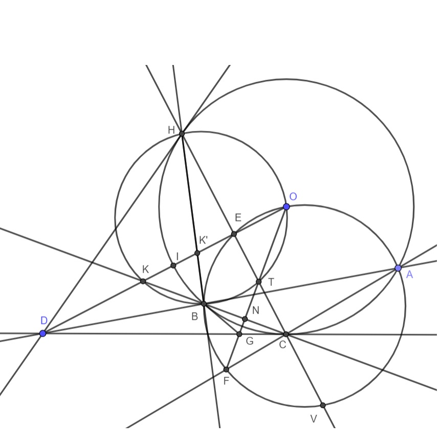 Проведем так же вторую касательную $DH$ к $\omega$ из точки $D$ пусть $E$' середина $CH$ тогда $DC^2=DE' \cdot DO = DB \cdot DA$ то есть $DA$ образ окружности $\Omega$ при инверсии $\omega$, то есть $E'=E$. Так как $OB=OA$ откуда $FO$ биссектриса $\angle BFC$ тогда $FO \perp BC$ пусть $N \in BC \cap FO$ тогда $\angle CNO = \angle CEO$ или $CNEO$ $(1)$ лежат на одной окружности, так как $DO$ биссектриса равнобедренного треугольника $DHC$ тогда $\angle KCH = \angle KHC$ но из $(1)$ получается $\angle KCH = \angle KOF$ то есть $KHOTB$ лежат на одной окружности
