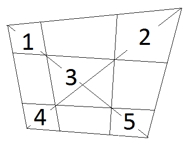 Задача №6. Выпуклый четырёхугольник поделен на девять четырехугольников четырьмя отрезками, точки пересечения которых лежат на диагоналях исходного четырехугольника (см. рисунок ниже). Известно, что в четырехугольники 1, 2, 3, 4 можно вписать окружности. Докажите, что в четырехугольник 5 также можно вписать окружность.
