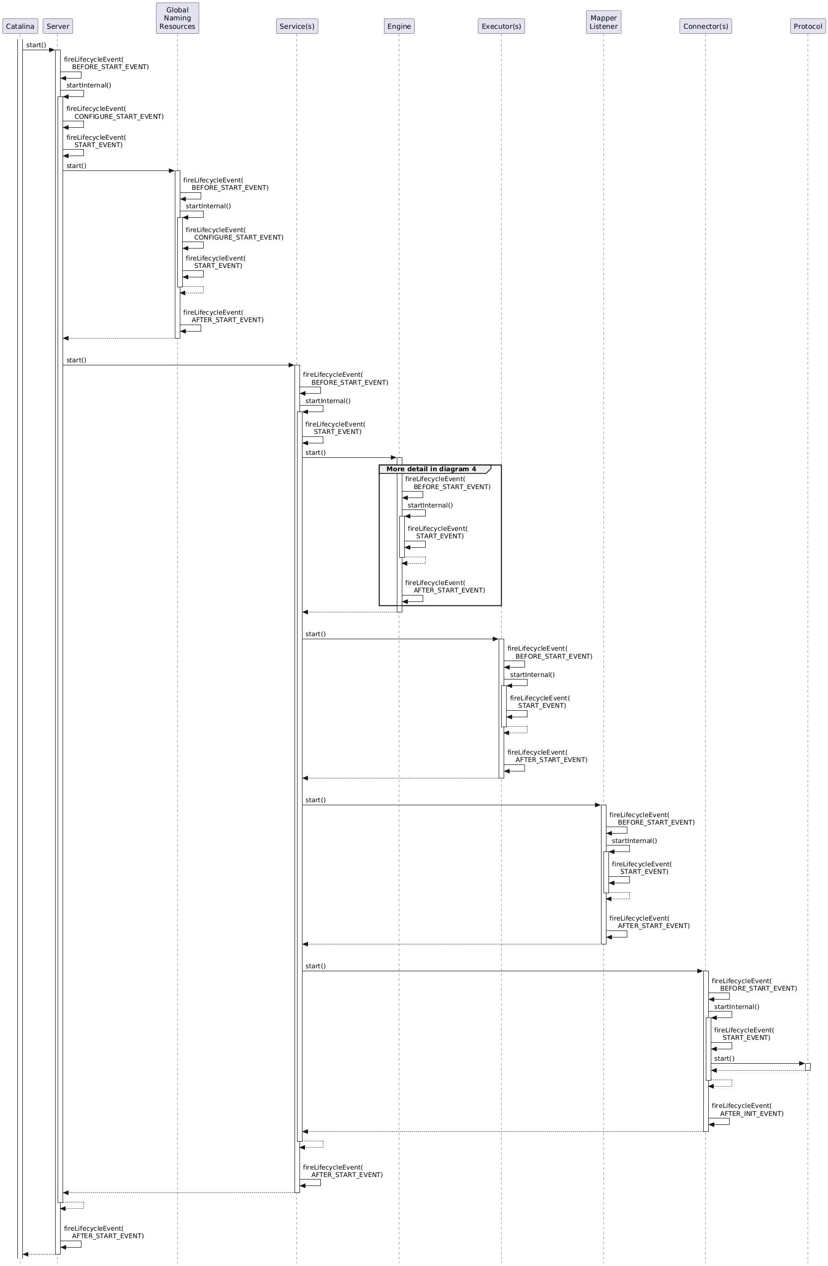 Diagram 3 shows how Tomcat starts the objects created by the Digester that were initialized in the previous step. This diagram also shows when lifecycle events are fired. There is more detail to the starting of the Engine (and other Containers) which is shown in the following diagram.