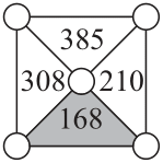 Есеп №13. Ссуреттегі дөңгелектерге 4, 5, 6, 7 және 11 сандары жазылған. Әр үшбұрышқа сол үшбұрыштың төбелеріндегі сандардың көбейтінділері жазылған. Сұр үшбұрыштың төбелеріндегі сандардың қосындысы нешеге тең?