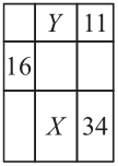 Есеп №9. Суретте периметрі 100-ге тең тіктөртбұрыш 9 кіші тіктөртбұрышқа бөлінген. Осы кіші тіктөртбұрыштардың бесеуінің периметрі суретте көрсетілген. $X-Y$ айырмасының мәні нешеге тең?