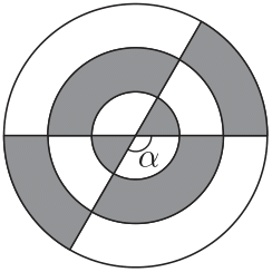 Есеп №17. Суретте центрлері ортақ ал радиустары 10, 20 және 30 см болатын үш шеңбер берілген. Егер $\alpha=120^\circ$ болса, онда боялған аумақтардың жалпы ауданы неше см$^2$-қа тең? ($\pi=3,\!14$ деп алыңыз.)