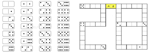 Задача №5. Набор из 28 различных доминошек выглядит так: Все эти 28 доминошек выложили так, что количество точек на соприкасающихся половинках доминошек одинаково. На некоторых половинках полностью стерли количество точек. В итоге получилась конструкция, изображенная на рисунке ниже (пустые половинки могли быть изначально пустыми, а могли содержать какое-то количество точек). Сколько точек на каждой из половинок жёлтой костяшки? Точек на половинке $A$: .... Точек на половинке $B$: ....