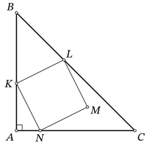 Задача №26. Дан прямоугольный равнобедренный треугольник $ABC$ с прямым углом $A$. Квадрат $KLMN$ расположен, как на рисунке: точки $K, L, N$ лежат на сторонах $AB, BC, AC$ соответственно, а точка $M$ расположена внутри треугольника $ABC$. Найдите длину отрезка $AC$, если известно, что $AK = 7$, $AN = 3$.