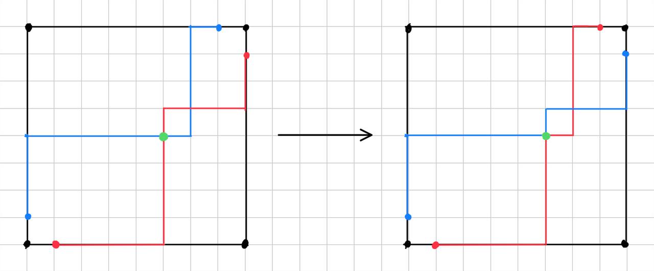 Найдем количество пар таких пересекающихся путей. Для этого рассмотрим биекцию которая "меняет местами" часть пути начиная с первого пересечения этих путей. По итогу кол-во пар таких пересекающихся путей равно кол-ву пар путей вида $(1,0)\rightsquigarrow (n-1,n)$ и $(0,1) \rightsquigarrow (n,n-1).$ Таких путей $\dbinom{2n-2}{n-2}^2.$