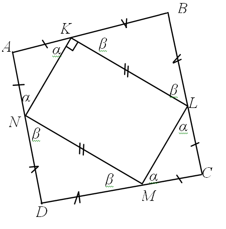 Комментарии от администратора Комментарии от администратора №1. Решение. Треугольники $ANK$, $BKL$, $CLM$ и $DMN$ — равнобедренные по условию. В равнобедренных треугольниках углы при основании равны. Пусть $\angle AKN = \angle ANK =\alpha$, $\angle BKL = \angle BLK = \beta$.