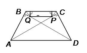 Комментарии от администратора Комментарии от администратора №1. Решение. Обозначим через $\rho (X,YZ) $ расстояние от точки $X$ до прямой $YZ$. Поскольку точка $P$ лежит на биссектрисе угла $C$, имеем $\rho (P,BC) = \rho (P,CD) $. Аналогично, $\rho (Q,AB) = \rho (Q,BC) $. Но, поскольку $QP \parallel BC$, имеем $\rho (Q,BC) = \rho (P,BC) $, откуда $\rho (Q,AB) = \rho (P,CD) $. Аналогично, $\rho (P,AB) = \rho (P,AD) = \rho (Q,AD) = \rho (Q,CD) $. Продолжим боковые стороны $AB$ и $CD $ до пересечения в точке $S$. Пусть точка $P'$ симметрична $Q$ относительно биссектрисы $\ell$ угла $ASD$. Тогда из симметрии $\rho (P',CD) = \rho (Q,AB) = \rho (P,CD) $ и $\rho (P',AB) = \rho (Q,CD) = \rho (P,AB) $. Таким образом, точки $P$ и $P'$ лежат внутри угла $ASD$ на прямых, параллельных $AB$ и $CD$ и отстоящих от них на расстояния $\rho (P,AB) $ и $\rho (P,CD) $ соответственно. Так как эти прямые не параллельны, у них только одна точка пересечения; значит, $P' = P$, точки $P $ и $Q$ симметричны относительно биссектрисы угла $ASD$, и $\ell \perp PQ \parallel AD$. Итак, в треугольнике $SAD $ биссектриса является высотой, углы при его основании равны, то есть трапеция $ABCD$ — равнобокая.