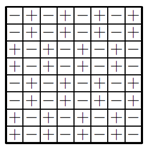 Решение. Покажем, что в каждом «кресте» из пяти клеток доски найдётся хотя бы одно неудачное расположение. Предположим противное; пусть в крайних клетках креста стоят числа $a$, $b$, $c$, $d$, а в центральной — $e$; обозначим через $S$ сумму всех этих пяти чисел. Тогда по нашему предположению $S-a = S-b = S-c = S-d = 0$, откуда $a = b = c = d$. Но в таком случае $e = -(a+b+c) = -3a$, что невозможно. Поскольку каждое расположение фигурки лежит не более, чем в одном кресте, получается, что в 36 крестах (с центрами во всех не крайних клетках) найдётся не менее 36 неудачных расположений. С другой стороны, на рисунке показан пример расстановки, при которой количество неудачных расположений равно 36 (в каждой клетке указан знак соответствующего числа). Действительно, в любом кресте неудачное расположение ровно одно, а все расположения, прилегающие длинной стороной к границе доски — удачные.