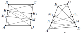 Комментарии от администратора Комментарии от администратора №1. Решение 1. Треугольники $ABM$ и $CDK$ равны по трём сторонам, значит, равны и их высоты $KK_1$ и $MM_1$. Если они равны $KM$, то они совпадают с $KM$, и утверждение задачи очевидно. Если же эти высоты меньше $KM$, то прямоугольные треугольники $KK_1M$ и $MM_1K$ равны по гипотенузе и катету; значит, равны их углы $K_1MK$ и $M_1KM$, что и требовалось доказать. На рисунках ниже показаны два возможных случая взаимного расположения треугольников $KK_1M$ и $MM_1K$.