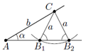 Доказательство. Возьмем угол $XAY$, равный $\alpha$, и отложим на стороне $AX$ отрезок $AC = b$. Третьи вершины искомых треугольников находятся на пересечении луча $AY$ и окружности радиуса $a$ с центром $C$. Таких точек не больше двух. Если их ровно две — $B_1$ и $B_2$ — то треугольник $CB_1B_2$ — равнобедренный. Пусть $AB_2 > AB_1$. Тогда $\angle CB_1A + \angle CB_2A = \angle CB_1A +\angle CB_1B_2 = 180^\circ$.
