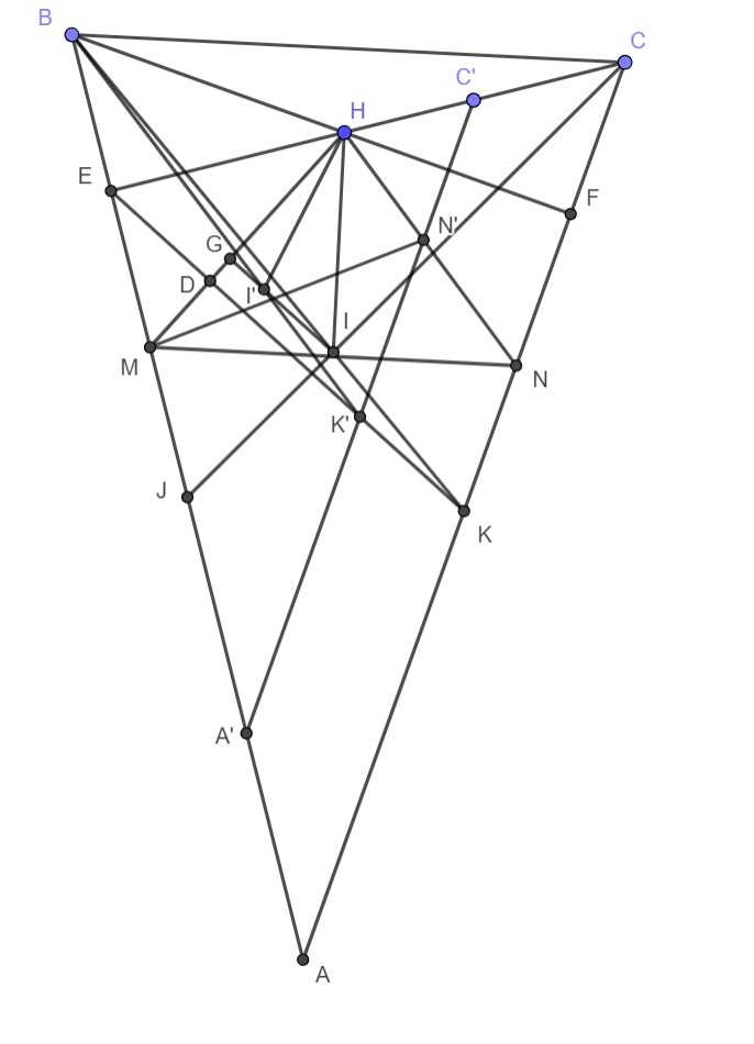 Предзадача: на том же построений пусть $K$ середина $AC$ пусть $C'A' || CA$ где $C' \in CE$ и $A' \in EA$ так же $K' \in EK \cap C'A'$ пусть $D \in MH \cap EK$ тогда $\angle MHF = 180-2a$ и $\angle EKC = 2a$ то есть $EK \perp MH$ проведем через $I$ прямую $IG || KK'$ где $G \in MH$ и $I' \in IG BK'$ тогда $\angle HII' = \angle HMN$ и пусть $N' \in A'C' \cap HN$ докажем что $HII'$ и $MNN'$ подобны.