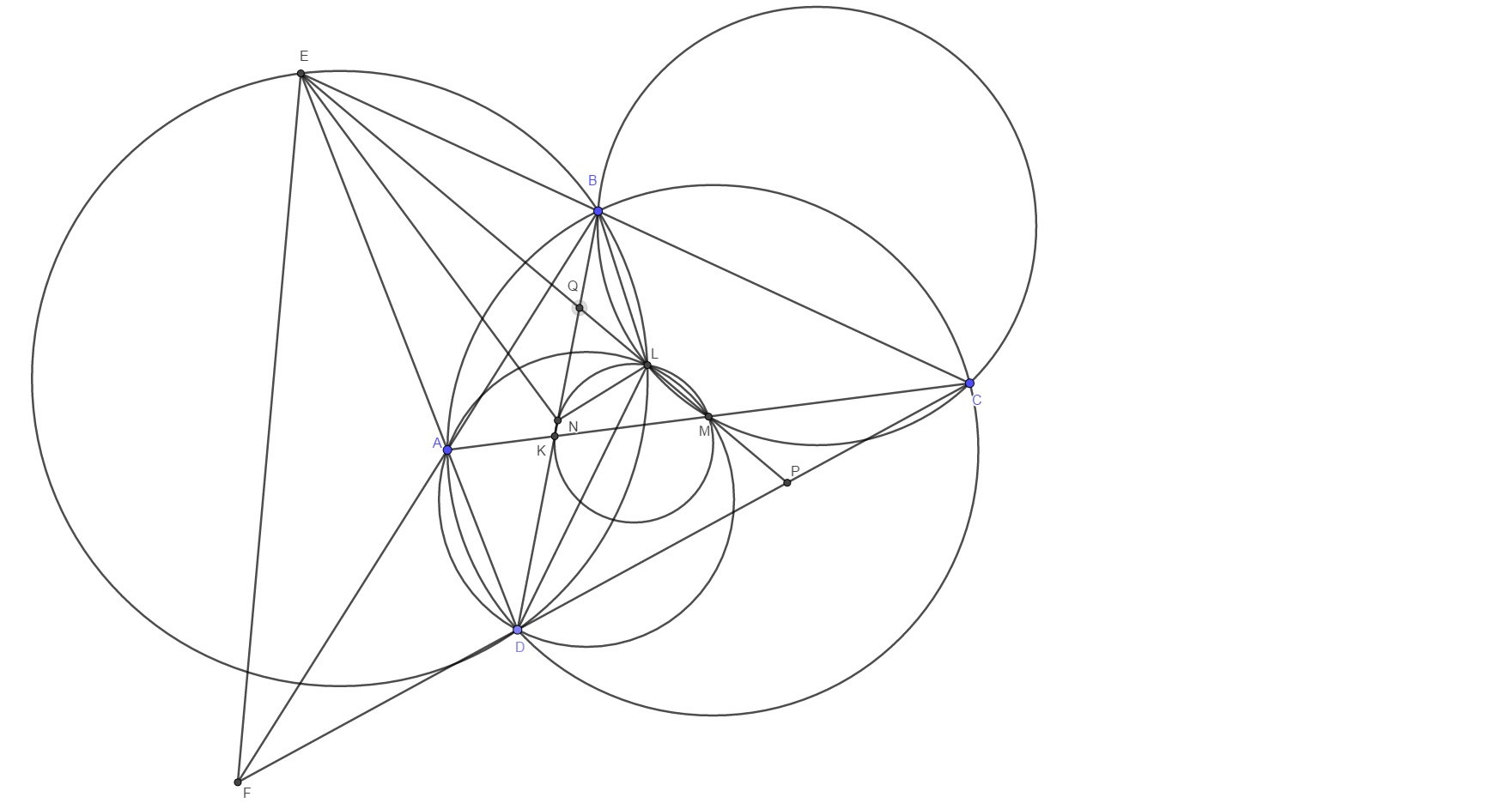4) из $\angle DEN = \angle QEB$ откуда $\angle ENB = \angle EMB$ но из пункта $3$ получаем $\angle BNL = \angle EMA = \angle ENB$ то есть $KNLM$ вписанный.