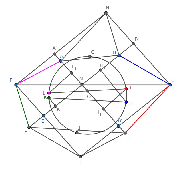 Тогда расстояние между центрами описанных треугольников $FA'M$ и $CD'M$ будет равно расстоянию между центрами $CB'M$ и $FE'M$ (из изначального построения) , опустив срединный перпендикуляры из точек $L,I$ на соответственные стороны $AM,DM$ как $L_{1},I_{1}$ и $Q \in AD \cap LI$ то