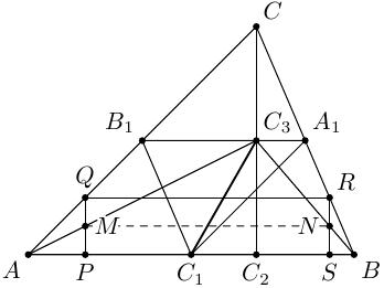 Из четырёх вершин прямоугольника какие-то две лежат на одной стороне. Пусть это прямоугольник $PQRS$, где точки $P$ и $S$ лежат на отрезке $AB$ (см. рис. выше). Так как $APQ$ и $AC_2C$ — прямоугольные подобные треугольники, то отрезок $AC_3$ делит отрезок $PQ$ пополам. Аналогично, $BC_3$ делит $RS$ пополам. Пусть $M$ и $N$ — середины отрезков $PQ$ и $RS$. Так как расстояния от точек $R$ и $Q$ до $AB$ равны, то расстояния от точек $M$ и $N$ до $AB$ также равны, то есть $MN \parallel AB$. Следовательно, $C_1C_3$ делит $MN$ пополам. А это значит, центр $PQRS$ лежит на отрезке $C_1C_3$.