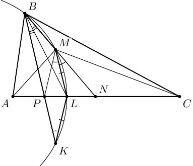 Комментарии от администратора Комментарии от администратора №2. Второе решение. Пусть $L$ — основание биссектрисы из вершины $M$ в треугольнике $PMN$. Тогда из условия задачи следует, что $\angle AML=\angle LMC$. Следовательно, точки $M,L,K$ лежат на окружности Аполлония $\omega $ для точек $A$ и $C$. Из симметрии заметим, что $\angle NML=\angle LMP=LKP$. Тогда $\angle BKL+\angle BML=\angle BLK+180{}^\circ -\angle NML=180{}^\circ $, то есть четырёхугольник $BMLK$ вписанный. Значит, точка $B$ также лежит на $\omega $, откуда $\angle ABL=\angle LBC$ и $\angle KBL=\angle LBM$, в силу того, что $KL=LM$. Откуда и следует утверждение задачи.