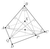 Комментарии от администратора Комментарии от администратора №1. Решение. Достаточно доказать, что расстояния от точек $A$ и $C$ до прямой $BX$ равны. Это равносильно тому, что $S_{ABX} = S_{BCX}$, поскольку у треугольников $ABX$ и $BCX $ общее основание $BX$. Поскольку $QX \parallel AB$, имеем $S_{ABX} = S_{ABQ}$. Аналогично, $S_{CBX} = S_{CBP}$. Заметим, что равнобедренные треугольники $ABP$ и $CBQ$ подобны по двум углам, поэтому $AB/BC = BP/BQ$, откуда $AB \cdot BQ = CB \cdot BP$. Так как $\angle ABP = \angle CBQ$, то и $\angle ABQ = \angle CBP$. Следовательно, площади треугольников $ABQ$ и $CBP$ относятся как произведения заключающих равные углы сторон, т. е. эти площади равны. Но тогда $S_{ABX} = S_{ABQ} = S_{CBP} = S_{CBX}$, что и требовалось доказать.