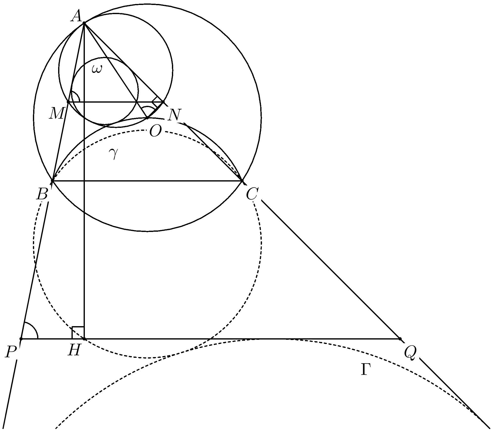 С другой стороны, в силу теоремы Фейербаха, вневписанная окружность $\Gamma$ треугольника $APQ$ (соответствующая вершине $A$) касается (внешним образом) дуги $BHC$ окружности $\gamma$. Значит $\Gamma$ — образ окружности $\omega$. Стало быть $\omega$ касается образа прямой $PQ$, т. е. описанной окружности треугольника $AMN$ (т. к. ${AM \cdot AB }= {AB \cdot AC} ={ AN \cdot AP}$). Таким образом, гомотетия с центром в $A$, переводящая треугольник $AMN$ в $ABC$, переводит $\omega$ в $\Omega$. Последнее завершает доказательство.