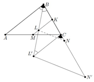 Комментарии от администратора Комментарии от администратора №1. Продлим $BN$ за $N$ и $BL$ за $L$ на отрезки $NN' = BN$ и $LL' = BL$ соответственно. Так как $M$ — середина $AC$ и $ML \parallel AB$, прямая $ML$ содержит среднюю линию $MK$ треугольника $ABC$. Поскольку $L$ — середина $BL'$, эта прямая содержит также среднюю линию $LK$ треугольника $BCL'$; итак, $CL' \parallel LM \parallel AB$. Поэтому $\angle CL'B = \angle L'BA = \angle L'BC$, откуда $CL' = CB$. Далее, $CN' = BN'-BC = 2BN-BC = BA$ и $\angle N'CL' = \angle CBA$. Значит, треугольники $N'CL'$ и $ABC$ равны, и потому $AC = N'L' = 2LN$.