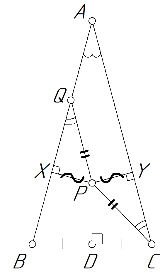 Теорема $(2)$: если у треугольников равны сторона и два соответствующих угла, то они равны. Действительно, сторона $PA-$ общая, $\angle PXQ=\angle PYC;\angle BAD=\angle CAD$