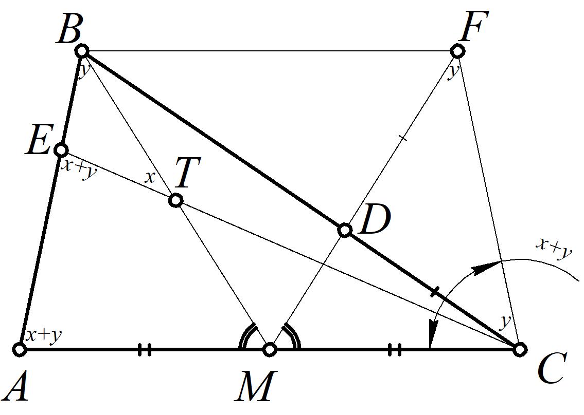 8) Из равенства треугольников (7) следует, что $\angle FCM=\angle BAM = x + y$ и $\angle ABM=\angle CFM = y$