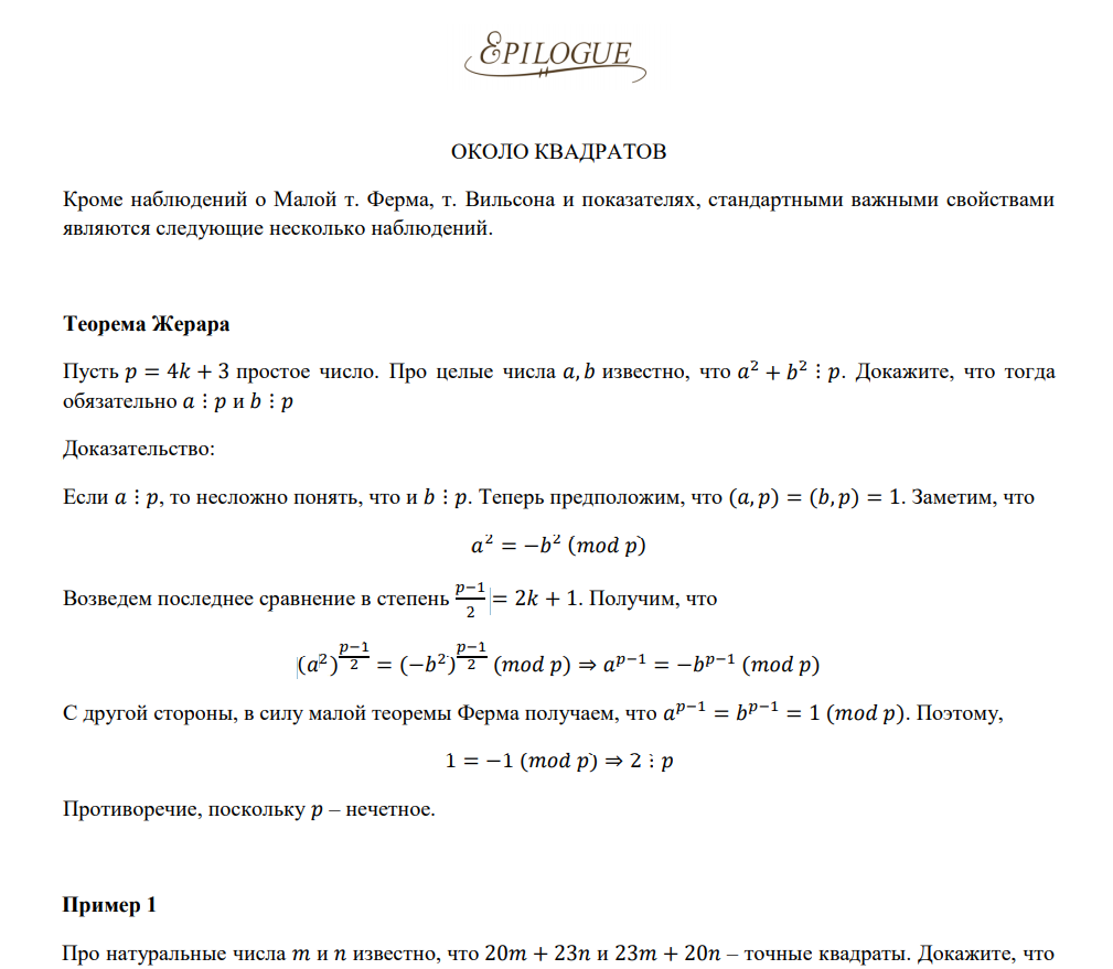 Если какие ни-будь $a^2$+$b^2$ делится на $p$ где $p$ вида $4k+3$, то $a$ и $b$ делятся на $p$ ($p$-простое)