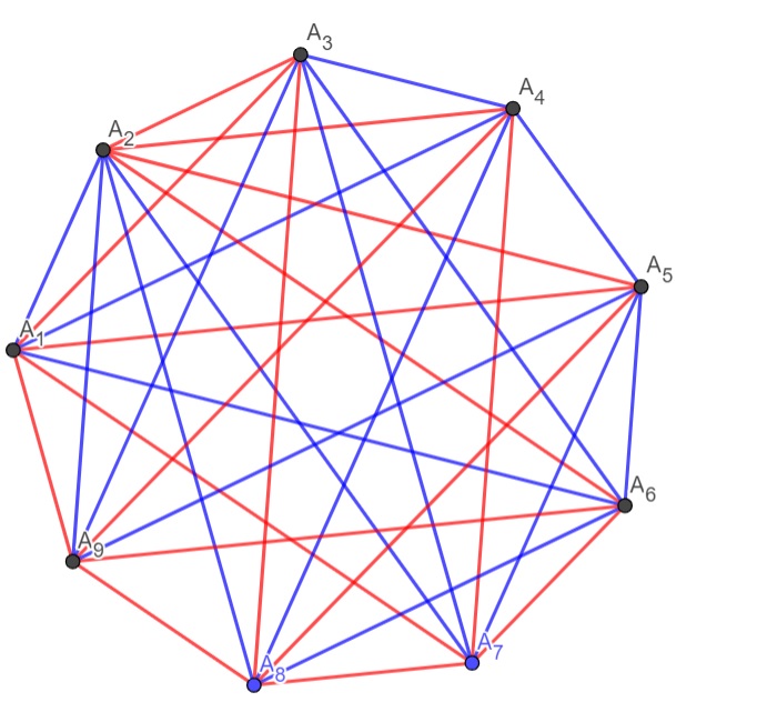 случай $1$ если из $A_{1}$ и соседние с ним $A_{2},A_{9}$ имеют разные цвета, то из них же однозначно проводятся отрезки $k-1$ c cиних и $8-k-1=7-k$ красных соответственно, значит $A(8) \leq 10-(k-1+7-k)=3$ вершины имеют степень $8$