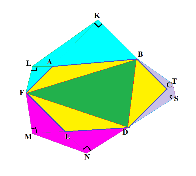 $$ \angle BAF=\alpha\Rightarrow \angle LAF = \pi -\alpha \quad \angle FED=\beta \Rightarrow \angle MEN=\pi-\beta \quad \angle BCD= \gamma \Rightarrow \angle DCS=\pi-\gamma$$