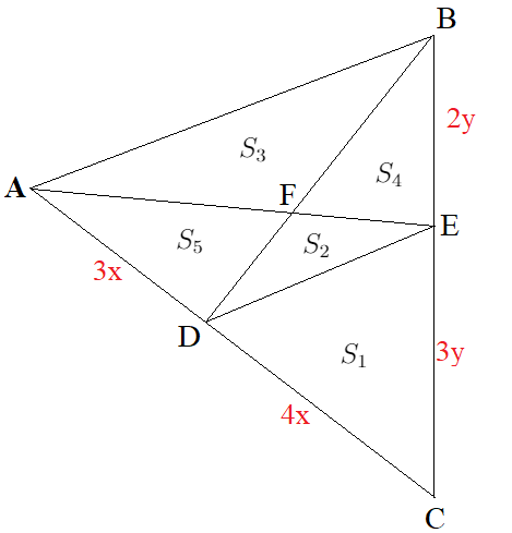 $$ \frac{S_1+S_2+S_5}{S}=\frac{\frac{1}{2}EC \cdot CA \sin\angle BAC}{\frac{1}{2}BC \cdot CA \sin\angle BAC}=\frac{21xy}{35xy}=\frac{21}{35}\Rightarrow \frac{S_2+S_5}{S}=\frac{9}{35}$$