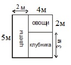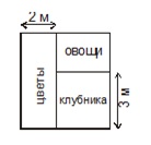 Маленький прямоугольный садик семейства Грин имеет площадь 30 м$^2$. Он разделен на 3 прямоугольных участка. Участок, на котором растут цветы, имеет площадь 10 м$^2$, а одна из его сторон равна 2 м. Одна из сторон участка, засаженного клубникой, равна 3 м. Чему равна площадь участка, отведенного под овощи?