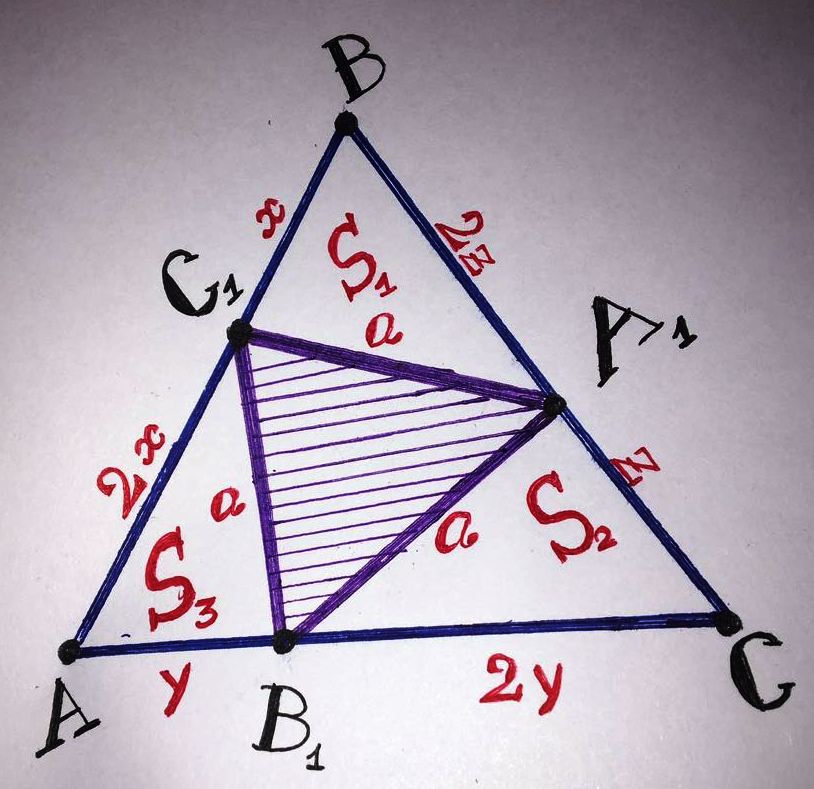 $$ \frac {S_1}{S_{\triangle ABC}}=\frac {S_2}{S_{\triangle ABC}}= \frac {S_3}{S_{\triangle ABC}}=\frac {2}{9} \Rightarrow \frac {S_{\triangle A_1B_1C_1}}{S_{\triangle ABC}}=\frac{1}{3}\Rightarrow $$