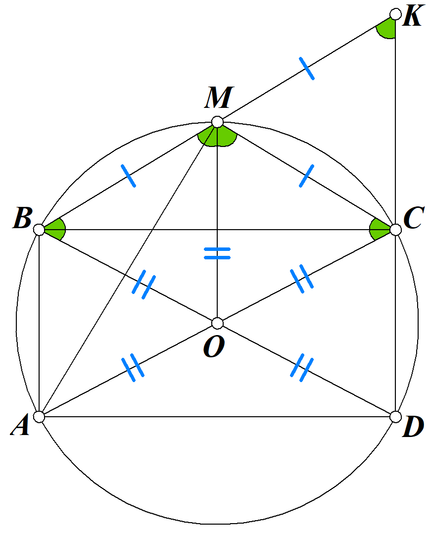 12) Из $(11,10,7)$ следует $\angle OBM=\angle OMB=\angle OMC=\angle OCM\rightarrow OB=OM=OC=OA=OD=R$