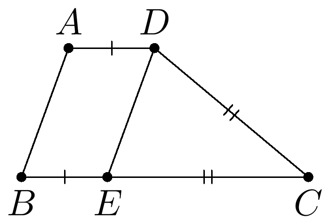 Решение. Отметим на отрезке $BC$ точку $E$ такую, что $BE=AD=3$. Тогда $ABED$ — параллелограмм, и $EC=10-3=7=CD$. Следовательно, $CDE$ — равнобедренный треугольник. Из этого равнобедренного треугольника найдем: $\angle BCD=180^\circ - \angle ADC=40^\circ$, $\angle ABC= \angle DEC = (180^\circ-\angle BCD)/2=70^\circ$.