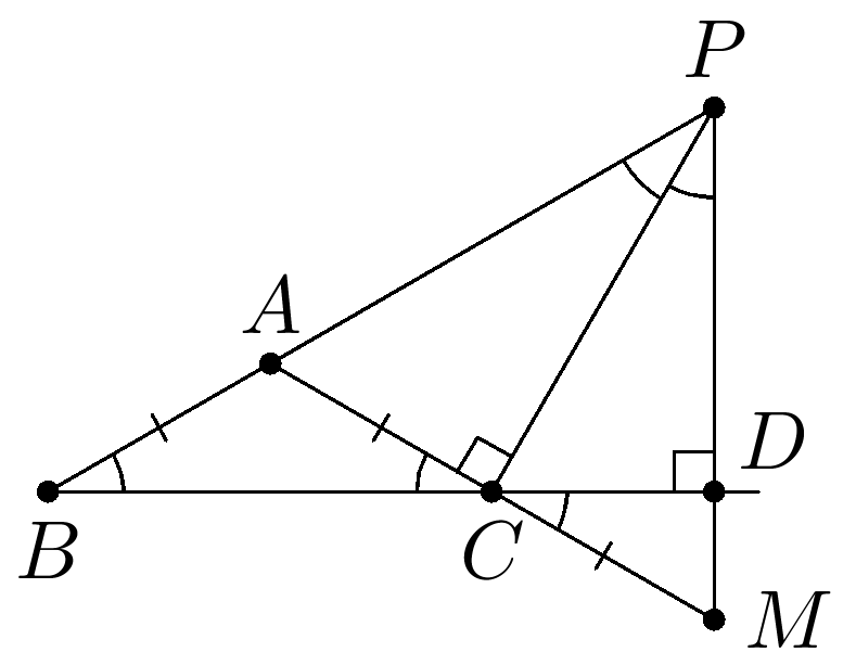 Решение. Известно, что сумма двух внутренних углов треугольника равна внешнему углу третьего. Пусть $\angle CBA=\angle BCA=\angle MCD= \alpha$, где $D$ — точка пересечения прямых $BC $ и $PM$. Тогда $\angle CMD= 90^\circ -\alpha$, откуда $\angle APC = \angle MPC=\alpha$, так как прямая $PC$ лежит на серединном перпендикуляре отрезка $AM$. Тогда из треугольника $BPC$ найдем $\angle PCD = 2 \alpha$, то есть $\angle PCM = 3 \alpha = 90^\circ$, откуда $\alpha=30^\circ$. Получается, что в равнобедренном треугольнике $APM$ $\angle APM = 2 \alpha = 60^\circ$.