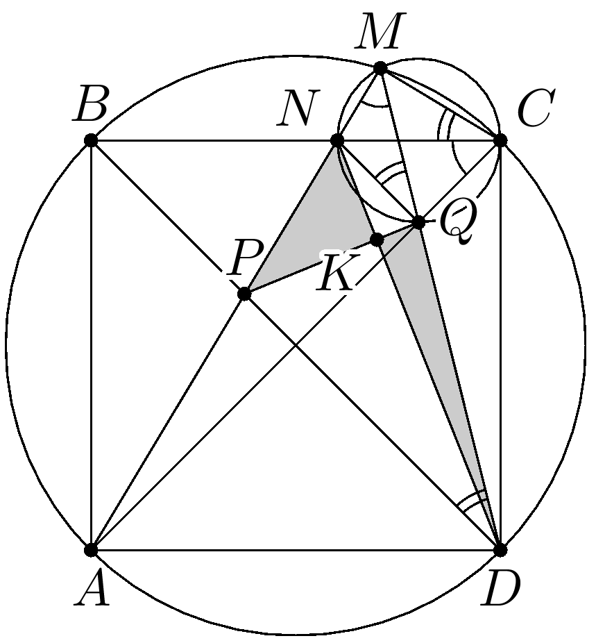 Решение. Пусть отрезки $AM$ и $BC$ пересекаются в точке $N$, а отрезки $PQ$ и $ND$ — в точке $K$. Угол $AMD$ опирается на дугу $AD$, поэтому он равен $45^\circ$. А так как и $\angle QCN = 45^\circ$, то точки $N$, $M$, $C$, $Q$ лежат на одной окружности. Следовательно $\angle MDB = \angle MCB = \angle MQN$, то есть $NQ