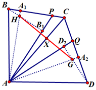 Решение. Обозначим $AA_1,BB_1,AA_2,DD_2$ высоты треугольников $ABP$ и $ADQ$ соответственно. Точки $H,A_1,C,X$ лежат на одной окружности $=>AH\cdot AA_1=AC\cdot AX$. Аналогично, $AG\cdot AA_2=AC\cdot AX,AH\cdot AA_1=AP\cdot AB_1,AG\cdot AA_2=AQ\cdot AD_2=> AP\cdot AB_1=AQ\cdot AD_2$.