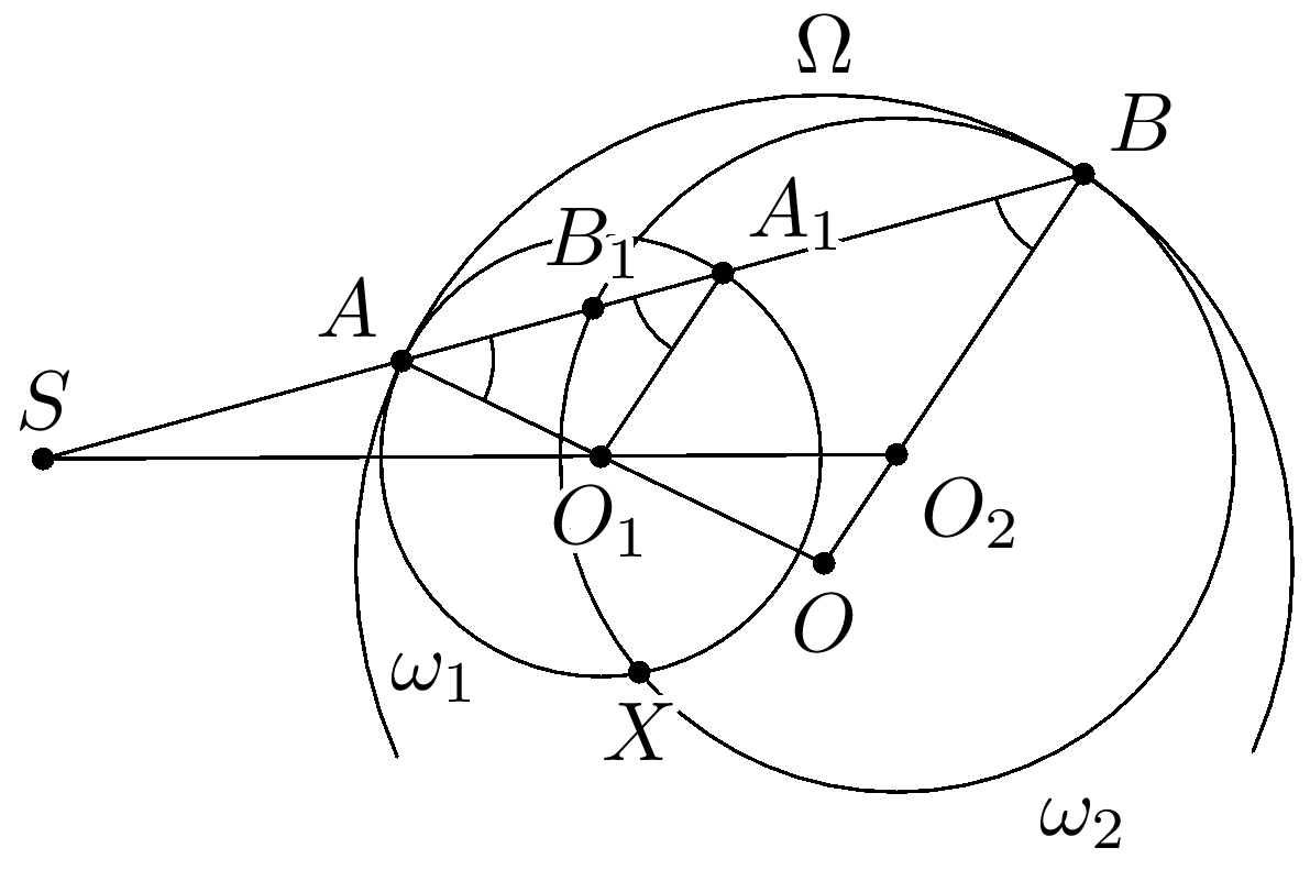 Комментарии от администратора Комментарии от администратора №1. Пусть $O_1$ и $r_1$ соответственно центр и радиус $\omega_1$, а $O_2$ и $r_2$ соответственно центр и радиус $\omega_2$. Пусть $\omega$ — вписанная окружность в криволинейного треугольника $A_1B_1X$, а $I$ — ее центр. Точку касания окружностей $\omega$ и $\omega_1$ обозначим через $P$, а окружностей $\omega$ и $\omega_2$ через $Q$. Пусть $AB \cap O_1O_2=S$. Легко заметить, что $\angle O_2BA = \angle O_1AB = \angle O_1A_1A$, то есть $O_1A_1 \parallel OB$. Тогда $S$ — центр гомотетии, переводящий $\omega_1$ в $\omega_2$, с коэффициентом $r_1/r_2$.
