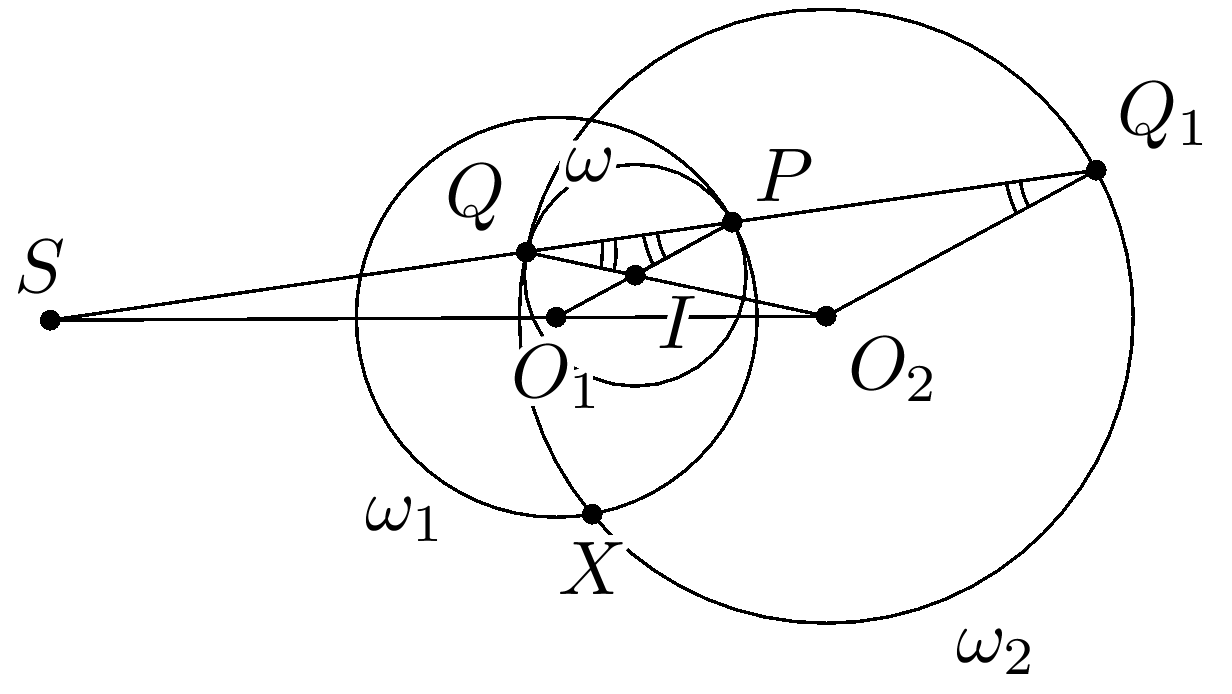 Теперь, обозначим $PQ \cap O_1O_2 =S'$. И пусть $PQ$ во второй раз пересекает $\omega_2$ в точке $Q_1$. Тогда $\angle O_2Q_1Q = \angle IQP = \angle QPI$, то есть $O_1P \parallel O_2Q_1$. Как видим, точка $S'$ также является центром гомотетии, переводящий $\omega_1$ в $\omega_2$ с положительным коэффициентом $r_1/r_2$. Следовательно, $S$ и $S'$ совпадают. Значит, $AB \cap PQ \cap O_1O_2 =S$.