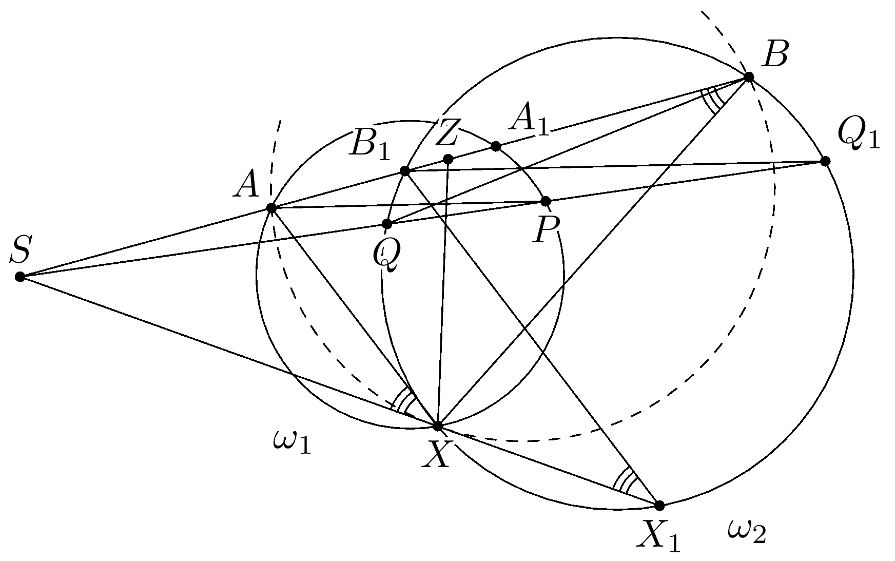 Для этого рассмотрим инверсию $F$ с радиусом $\sqrt{SA \cdot SB}$ и центром в точке $S$. Ясно что такая инверсия переводит окружность $\Omega$ саму в себя. Далее, поскольку $\frac{SA}{SA_1}$ $=$ $\frac{SB_1}{SB}$, то $SA \cdot SB$ $=$ $SA_1 \cdot SB_1$. Это значит, что окружность $\omega_1$, проходящая через точки $A$ и $A_1$ и касающаяся окружности $\Omega$ в точке $A$ перейдет в окружность, проходящую через точки $B$ и $B_1$ и касающуюся $\Omega$ в точке $B$, то есть в окружность $\omega_2$ (Причем внешние дуги ($XAY$ и $XBY$) соответствующих окружностей перейдут друг в друга, а внутренняя дуга $XA_1Y$ в дугу $XB_1Y$). Что влечет за собой, то что точки $P$ и $Q$ перейдут друг в друга, а точка $X$ сама в себя.
