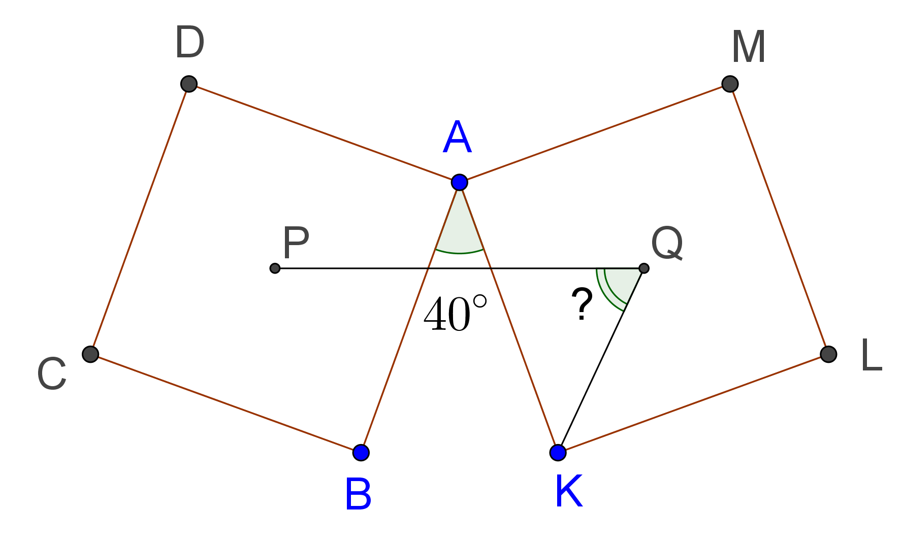 $ABCD$ квадратын $130^\circ$-ға сағат тіліне қарсы бұрғанда, $AKLM$ квадраты алынған (төмендегі суретті қара). $P$ — $ABCD$ центрі, $Q$ — $AKLM$ центр. $PQK$ бұрышын табыңыз.