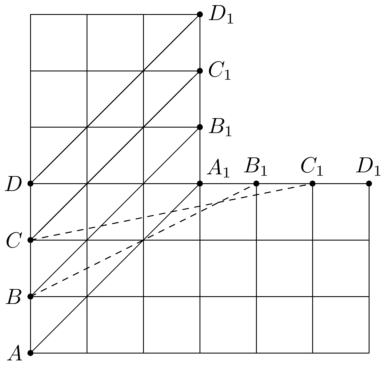 Куб состоит из 27 одинаковых кубиков, на ребрах которого отмечены точки $A,B,C,D,{{A}_{1}},{{B}_{1}},{{C}_{1}},{{D}_{1}}$ (см. рис. ниже). Четыре жука, имеющие одинаковые скорости, участвуют в необычном марафоне. У каждого есть свой старт и финиш: у первого это $A$ и ${{A}_{1}}$, у второго – $B$ и ${{B}_{1}}$, у третьего – $C$ и ${{C}_{1}}$ и, наконец, у четвертого – $D$ и ${{D}_{1}}$. При этом жуки могут перемещаться по поверхности куба по наикратчайшему пути. Если все жуки стартуют одновременно, то какой жук финиширует первым?