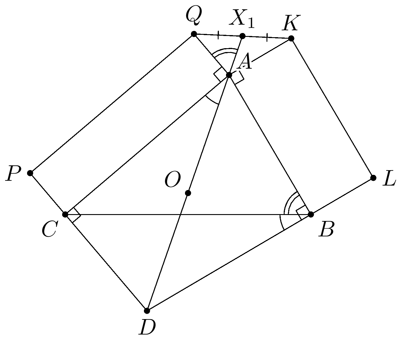 Обозначим $D=CP \cap BL$. Тогда точки $A,B,C,D$ лежат на одной окружности с диаметром $AD$; также на этом диаметре лежит точка $O$. Пусть $X_1=AD \cap KQ$. Так как $\angle CAD = \angle CBD$ и $$\angle CAD + \angle QAX_1= \angle CBD + \angle ABC = 90^\circ,$$ то $\angle QAX_1=\angle ABC$. Аналогично, $\angle KAX_1 = \angle ACB$. Пусть прямоугольники имеют площадь $S$. Тогда, $$\frac{QX_1}{KX_1}=\frac{AQ}{AK} \cdot \frac{\sin QAX_1}{\sin KAX_1} = \frac{S/AC}{S/AB} \cdot \frac{\sin ABC}{\sin ACB} =\frac{AB}{AC} \cdot \frac{AC}{AB}=1,$$ то есть $X_1$ — середина отрезка $QK$ или $X_1$ совпадает с $X$. Следовательно, прямая $AX$ проходит через точку $O$. Аналогичное утверждение можно доказать для прямых $BY$ и $CZ$.