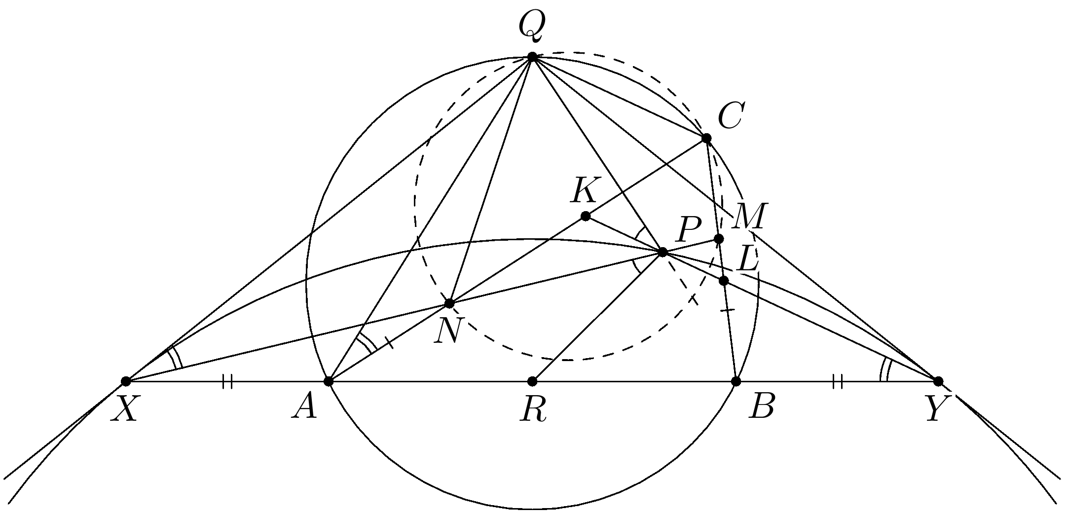 Следовательно, прямые $QX$ и $QY$ — касательные к описанной окружности треугольника $PXY$. Тогда по свойству симедианы, прямая $QP$ как раз и есть симедиана треугольника $PXY$. Значит, $\angle QPK =\angle XPR = \angle RPN$.