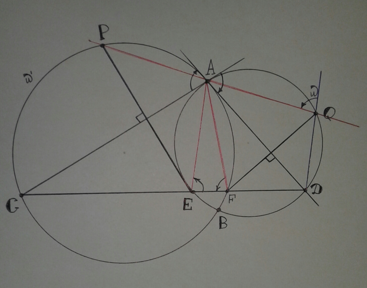 Окружности $\omega$ и $\omega'$ пересекаются в точках $A$ и $B$. Касательная к окружности $\omega$, проходящая через точку $A$, пересекает окружность $\omega'$ в точке $C$. Касательная к окружности $\omega'$, проходящая через $A$, пересекает $\omega$ в точке $D$. Прямая $CD$ пересекает окружности $\omega$ и $\omega'$ в точках $E$ и $F$ соответственно. Перпендикуляр из точки $E$ к прямой $AC$ пересекает $\omega'$ в точке $P$; перпендикуляр из точки $F$ к прямой $AD$ пересекает $\omega$ в точке $Q$; Точки $A$, $P$ и $Q$ лежат по одну сторону от прямой $CD$. Докажите, что точки $A$, $P$ и $Q$ лежат на одной прямой.