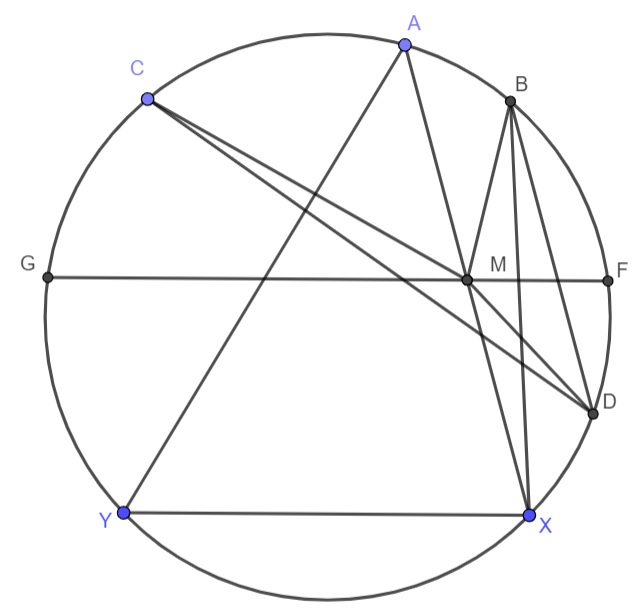 Пусть $\omega$ окружность около $ABC$, из условия получается что $BX=CY$ и $BC ||YX$, проведем отрезок $GF$ в $\omega$ такой что $YX || GF$ и проходящий через $M$, возьмем на $\omega$ такую точку $D$ что $BM=DM$ тогда из того что $M$ середина, получается что $ABDC$ равнобедренная трапеция, тогда $BX=AD$ тогда $CY = AD$ откуда $CD=AY$ тогда по неравенству треугольника $CM+BM = CM+DM>CD=AY$