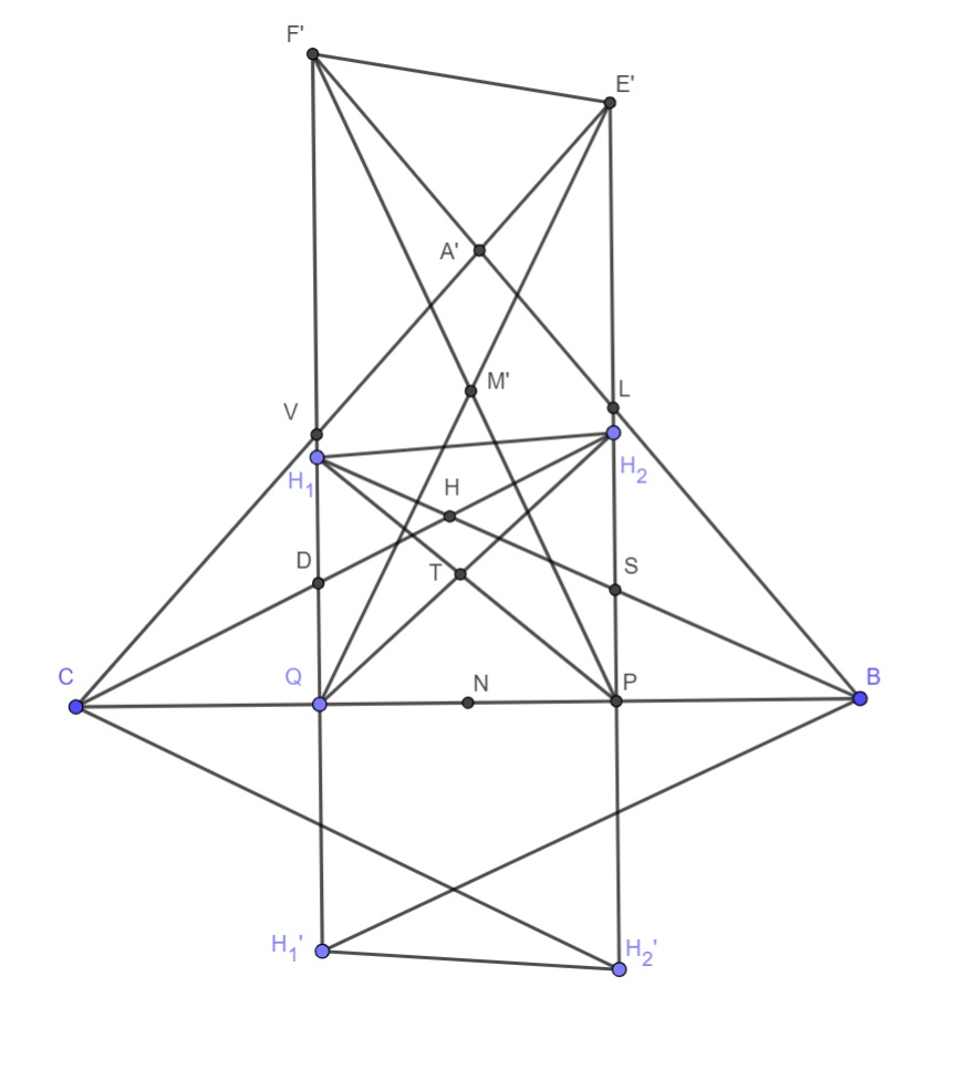 Пусть $\angle H_{2}H_{1}B=a, \ \angle H_{1}H_{2}C=b, \ \angle BH_{1}P=x, \ \angle CH_{2}Q=c, \ \angle HTH_{1}=t, \ \angle HTH_{2} =d, \ \angle E'F'B = m, \angle F'E'C = n$ так как по вышеописанному выполняется $t+d=m+n$ покажем что $\dfrac{\sin(d)}{\sin(t)} = \dfrac{\sin(n)}{\sin(m)}$ это и будет значит что $d=n, t=m$