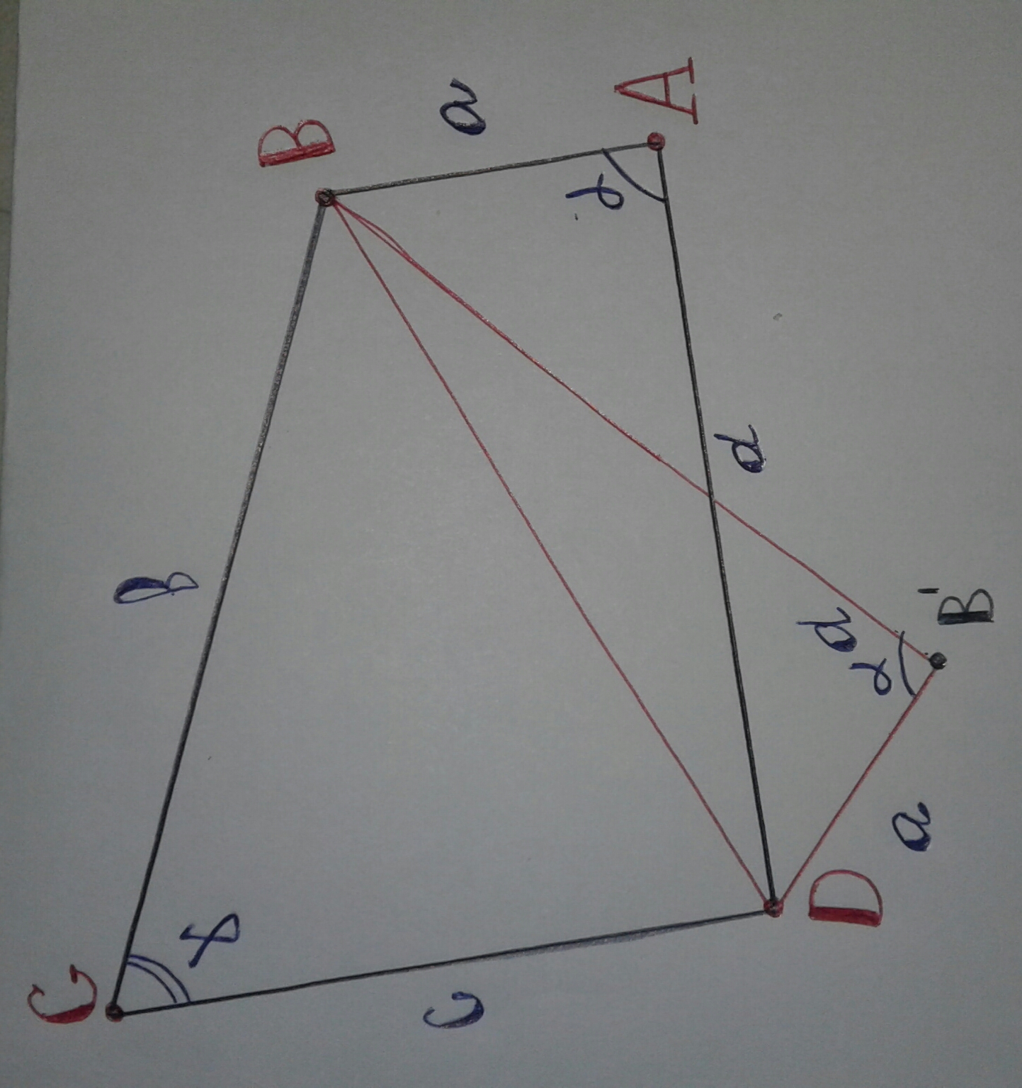$$= \frac{1}{2} \cdot ac \cdot \sin(\angle B'DC) +\frac{1}{2} \cdot bd\cdot \sin(\angle CDB')\leq \frac{ac}{2}+ \frac{bd}{2} \Leftrightarrow |\sin \alpha | \leq 1$$