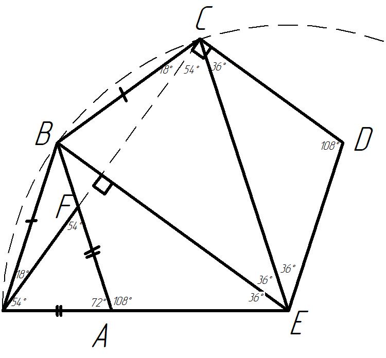 В правильном пятиугольнике $ABCDE$ прямая, проходящая через точку $C$ перпендикулярно $CD$, пересекает отрезок $AB$ в точке $F$. Докажите, что $AE+AF=BE$.